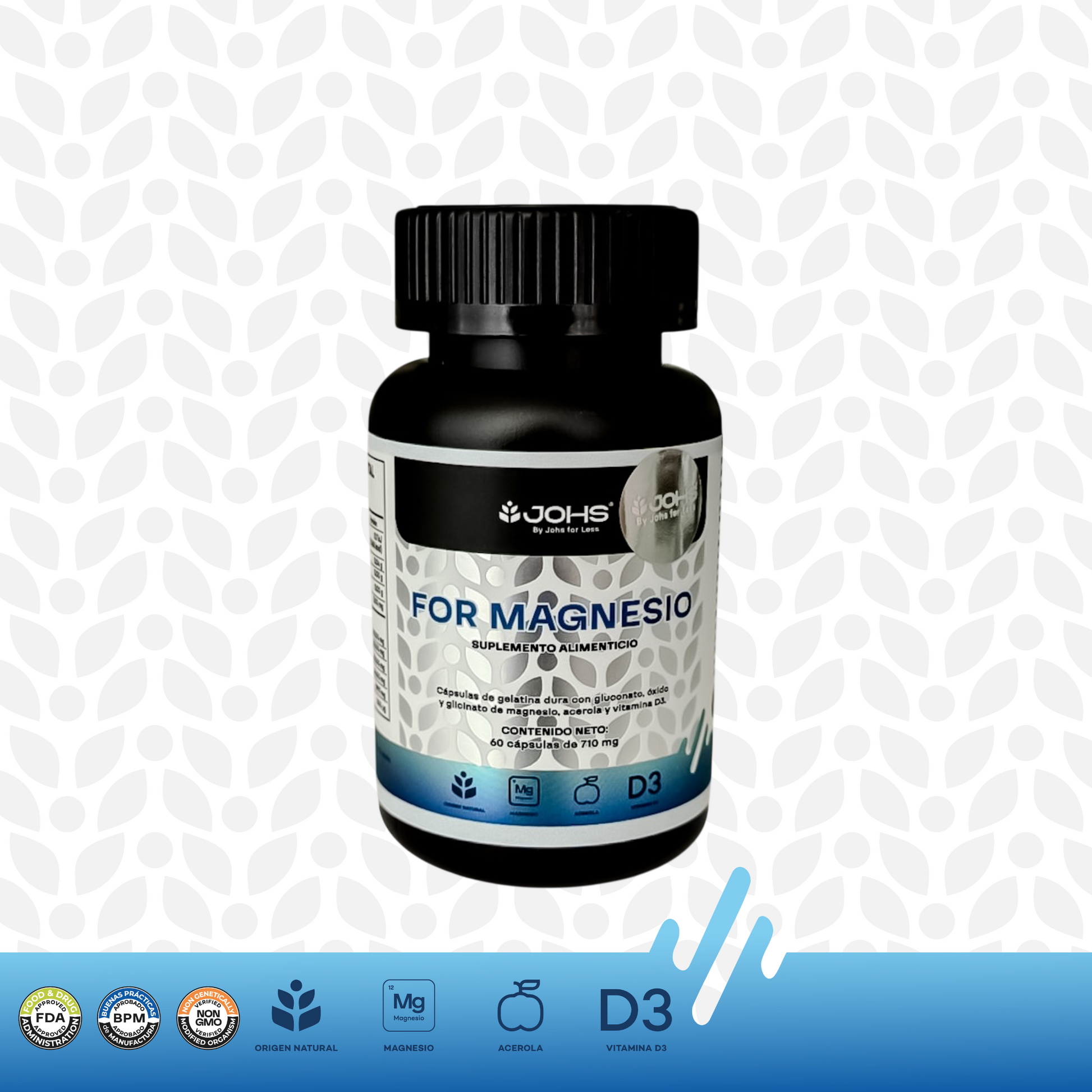 Cápsulas de gelatina dura con citrato, gluconato, oxido y glicinato de magnesio, acerola y vitamina D3.