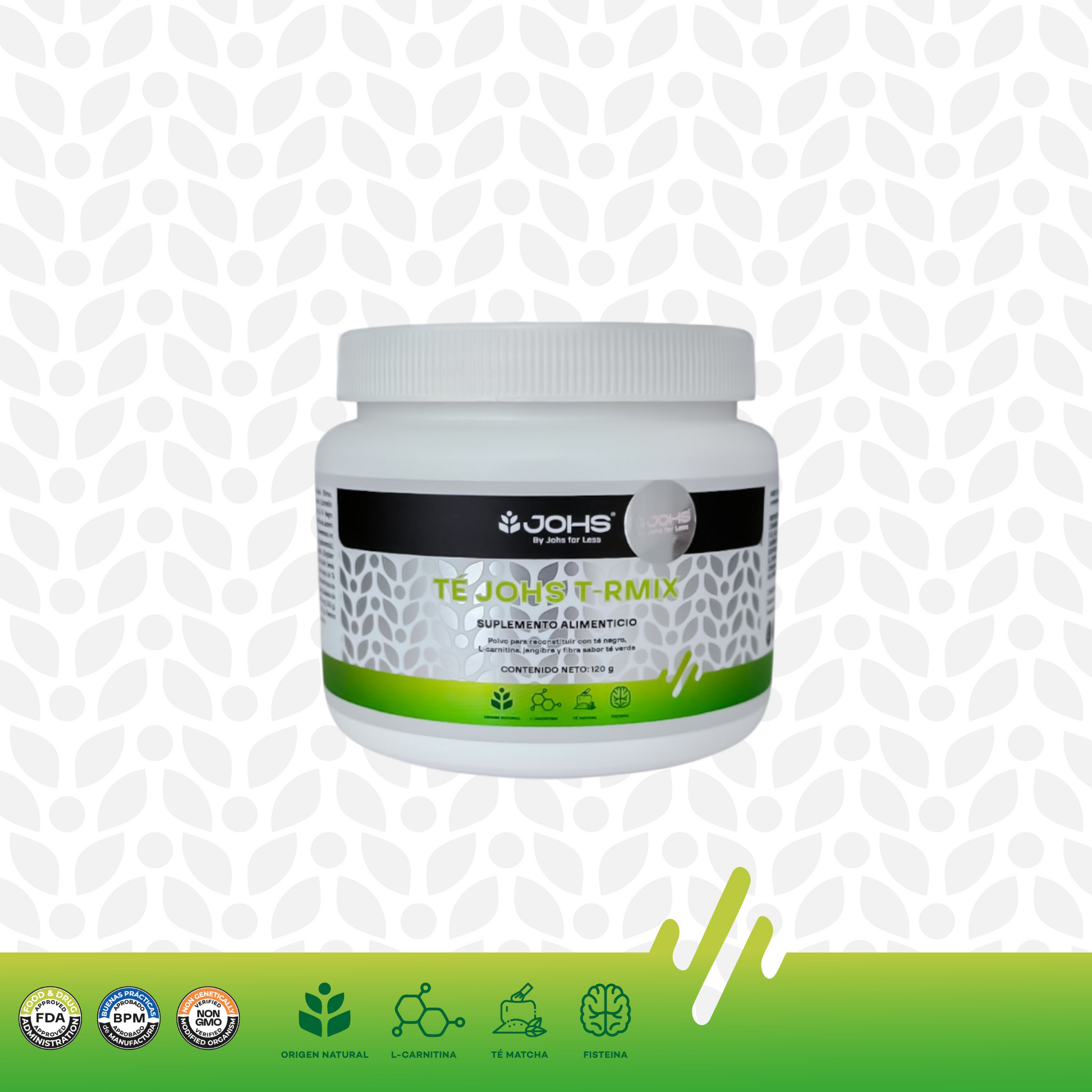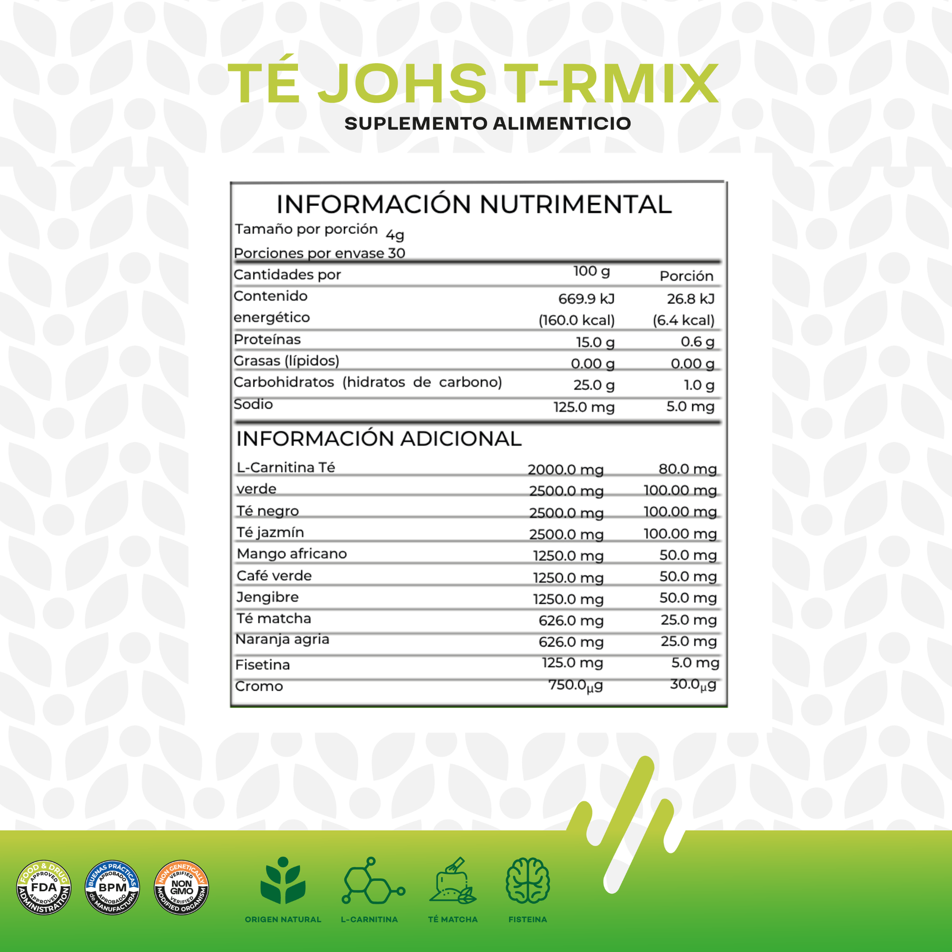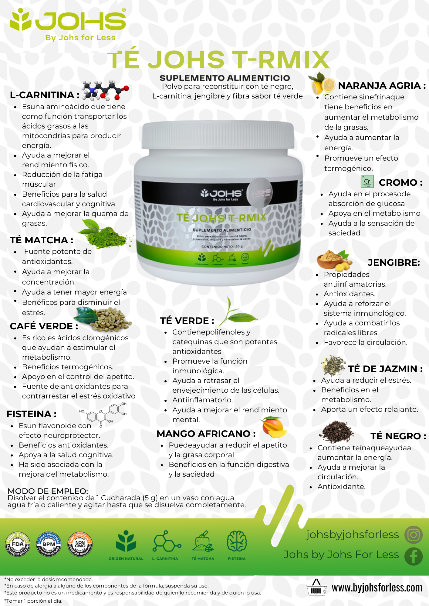 3) Ingredientes: Polidextrosa, saborizantes, ácido cítrico, concentrado en polvo de la hoja de té verde, concentrado en polvo de la hoja de té negro, concentrado en polvo de la flor de jazmín, l-carnitina tartrato, concentrado en polvo del fruto de mango africano, concentrado en polvo de la raiz de jengibre, concentrado en polvo del fruto de café verde, concentrado en polvo de la hoja de té matcha, concentrado en polvo del fruto de naranja agria, goma xantana, dióxido de silicio, estevia, monk fruit, fisetina, polinicotinato de cromo